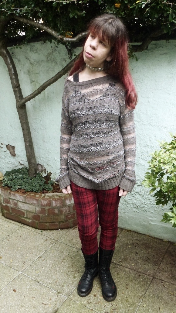 This look is inspired by the kind of everyday soft punk look from the mid to late 70’s – before the media and Malcom McLaren labelled it punk: A knitted mesh jumper, tartan trousers, a dog collar and not forgetting DM’s of course.