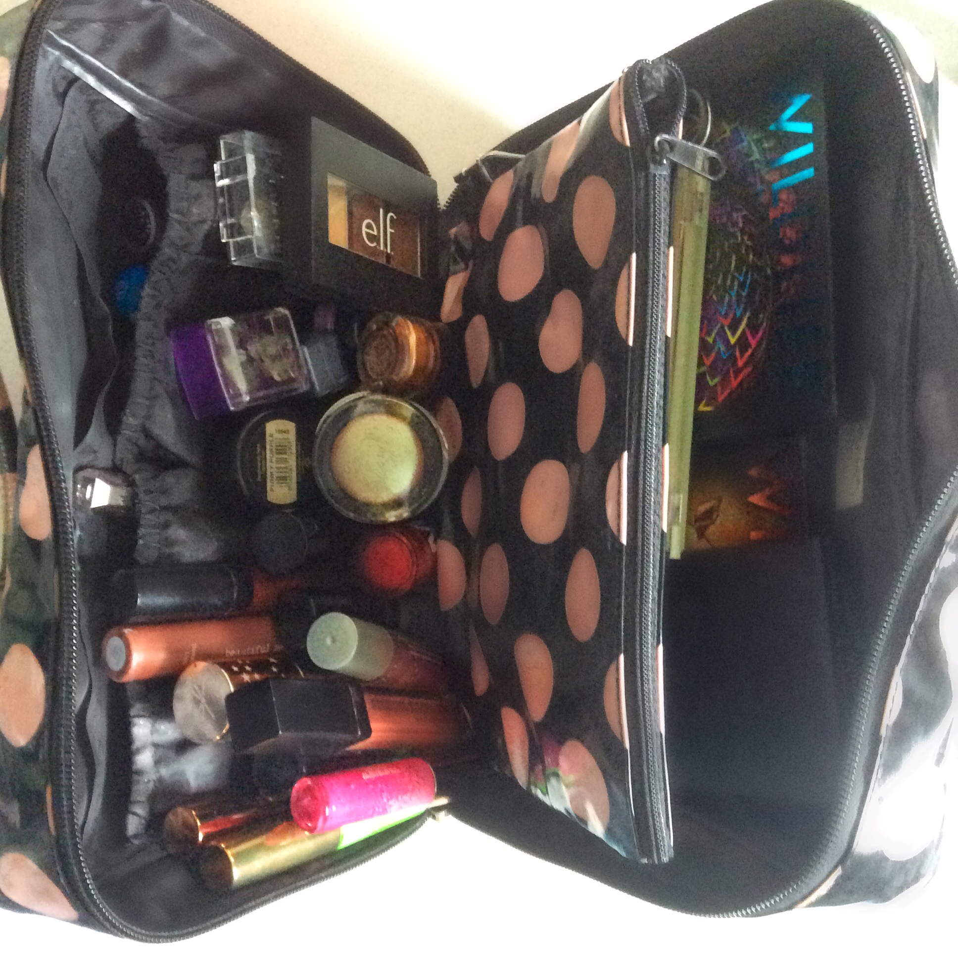 I wiped down my bag inside and out and moved the zip pocket from the middle, over to one side. Now it holds up my pallets and contains my eye and lip liners. I put my lippies in the gathered pockets and my eyeshadows and lipgloss in the main compartment. Now I can finally see everything!